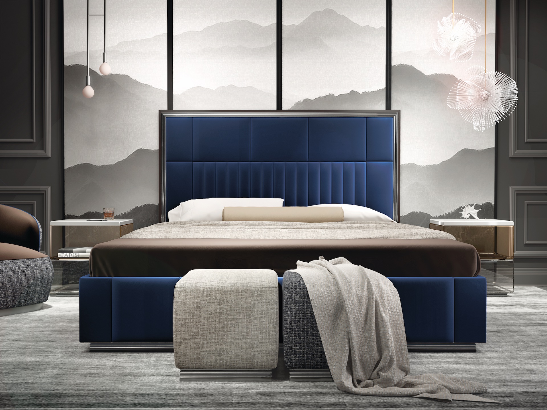 P0341 Bed chrome metal feet Dimensions Metraggio upholstery COM fabric (H 140 cm): 5 ml skin: 10 sqm Packaging 4 packages (195x12x145, 210x30x20, 210x12x30, 200x90x6) 0.65 cu m 127 kg