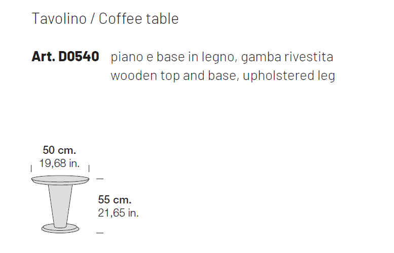 Piano e base in legno, gamba rivestita. Wooden top and base, upholstered leg.