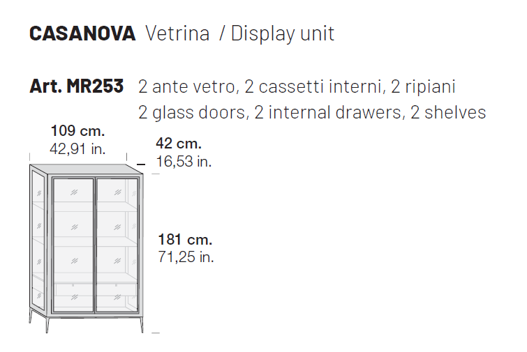 2 Ante vetro, 2 cassetti interni, 2 ripiani.