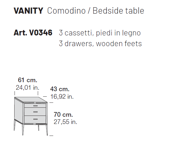 D0327 Comodino 3 cassetti profili e piedini in metallo cromato cassetti con guide ammortizzate auto-ritiranti Dimensioni Imballaggio 1 collo (45x60x71) 0,19 mc 33 kg